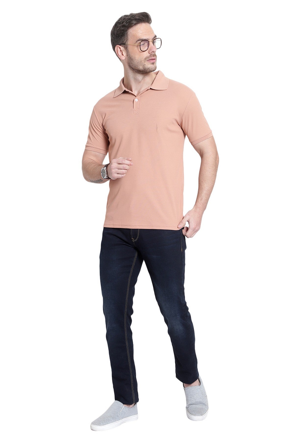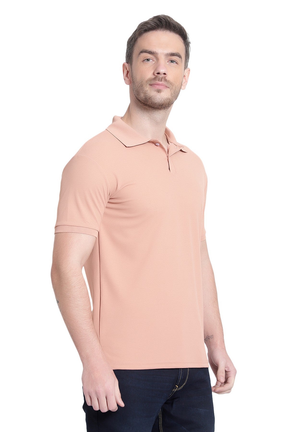 Solid Men's Polo Neck Peach T-Shirt is a great choice for a casual wardrobe. Crafted from a lightweight blend of cotton and polyester, it features a ribbed collar for increased durability and a classic fit with a 3-button placket to keep you comfortable all day long. Its muted peach hue allows you to easily match it with any casual ensemble.