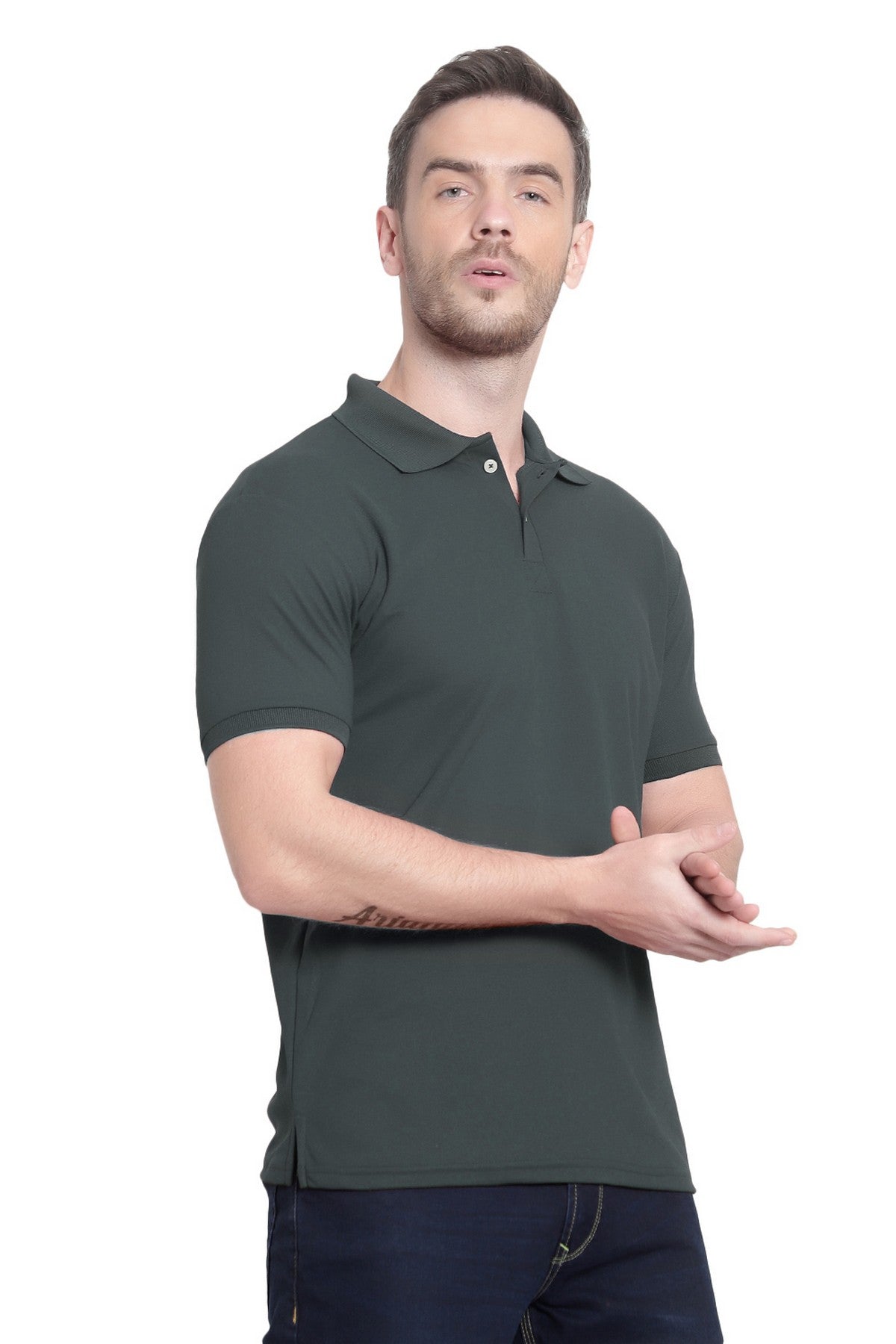 This classic men's polo neck T-shirt is a wardrobe essential. Made of solid dark green cotton, this timeless piece is designed to keep you comfortable in any situation. With its fitted silhouette and easy-to-style neutral color, this shirt is perfect for everyday wear.